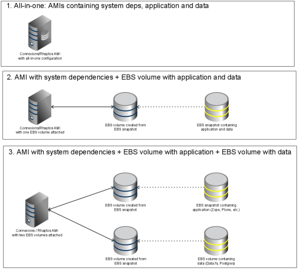 In this usage scenario, we create specialized AMIs based on the standard Debian Lenny AMI, and make these AMIs publicly available in the AMI directory. These AMIs contain the entire stack necessary to run an instance of Rhaptos or Connexions software including the data. Everything lives on the EC2 instance, and no EBS volumes are mounted. These instances launch in about 3-7 minutes and Plone is running almost immediately after they’ve finished booting up.