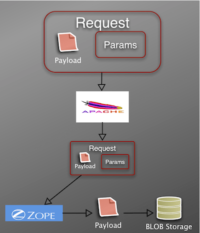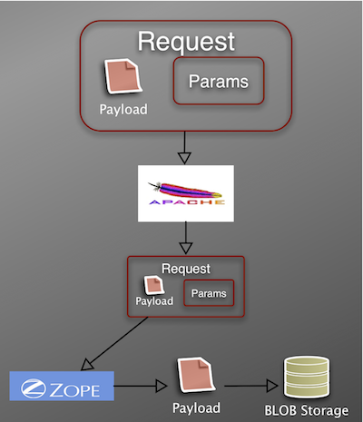 • Once Zope has parsed the request, it can then write the file data – in this case it writes the data to ZODB BLOB storage.