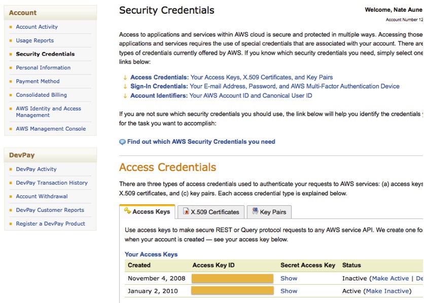 Obviously, you need to replace the <your_access_key_id> and <your_secret_access_key> with your actual keys which you can find by logging into aws.amazon.com, and clicking on the Security Credentials tab.