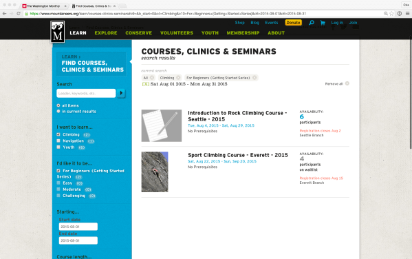 But it’s not just for e-commerce. Imagine you run a non-profit like The Mountaineers that offers courses in outdoorsmanship. Perhaps I come to visit your site. I would like to take a class, learn something new. I’ve never been climbing before, but it looks fun. I am an absolute beginner, never climbed a mountain in my life. Oh, and I know I’ve got some time off later this summer! Cool, in three clicks I’ve narrowed the selection of hundreds of courses offered by your organization down to just a few! I can read about each, find the one that fits me best, and head to registration. We call this “faceted search”.