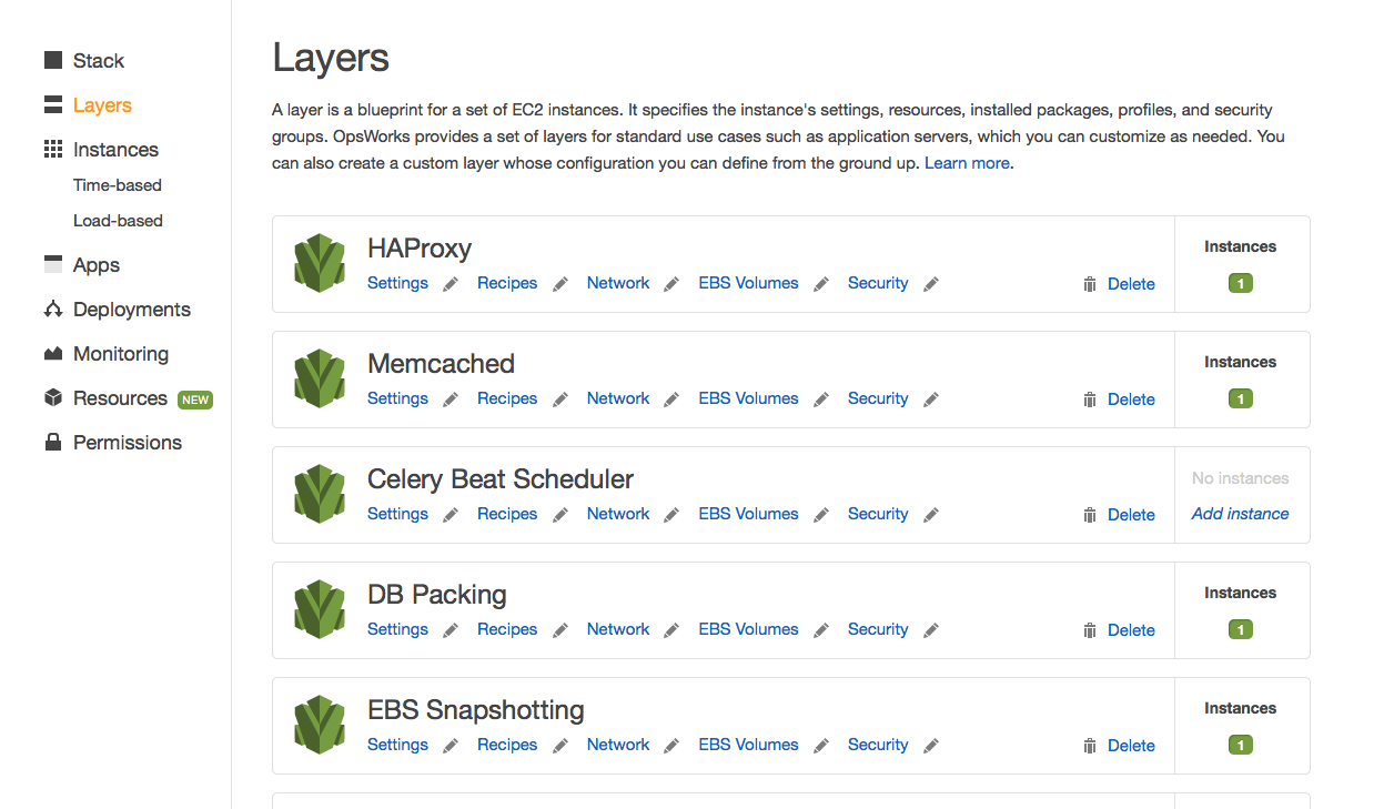 - Within the stack you define layers that represent the services or functionality your app requires. For example, you might define layers for an app server, front end, task queue, caching, etc. The layers define the resources they need – Elastic IPs, EBS volumes, RAID10 arrays, or whatever.
